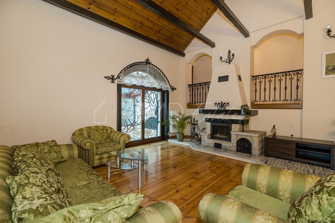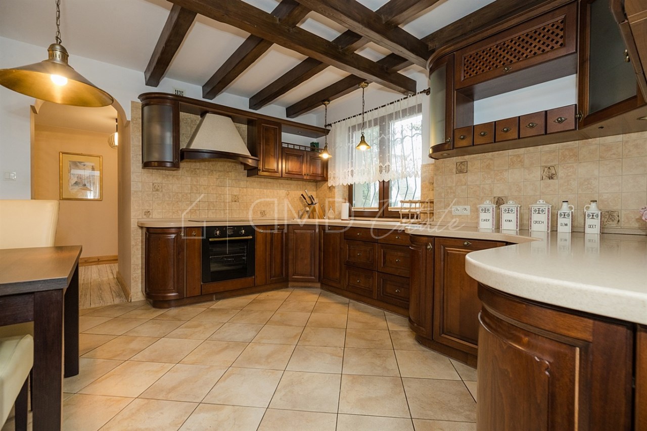 Parter tworzy przestronny salon z kominkiem i jadalnią, połączony z dużą, w pełni wyposażoną kuchnią. Z salonu prowadzi wyjście do ogrodu zimowego z klimatyzacją i elektryczną roletą dachową, a następnie do zadbanego ogrodu z oczkiem wodnym oraz oświetloną altaną.