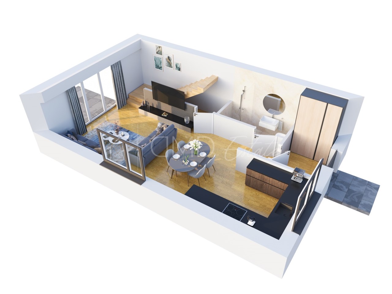 Funkcjonalny układ zapewnia podział na część dzienną i prywatną.